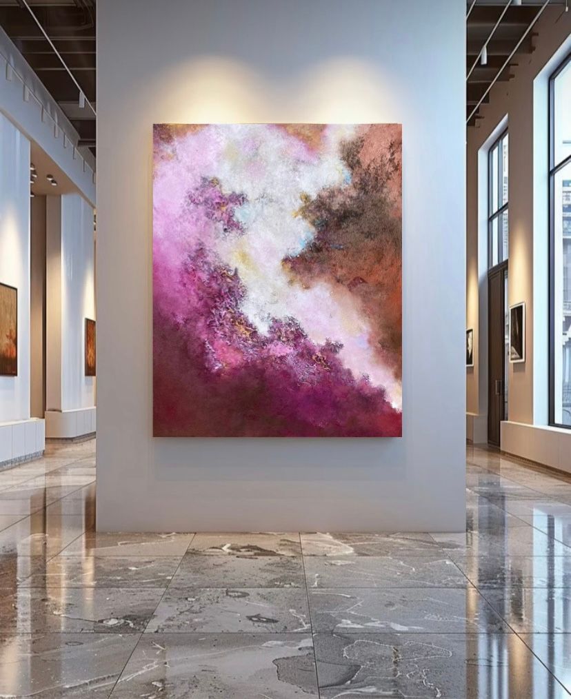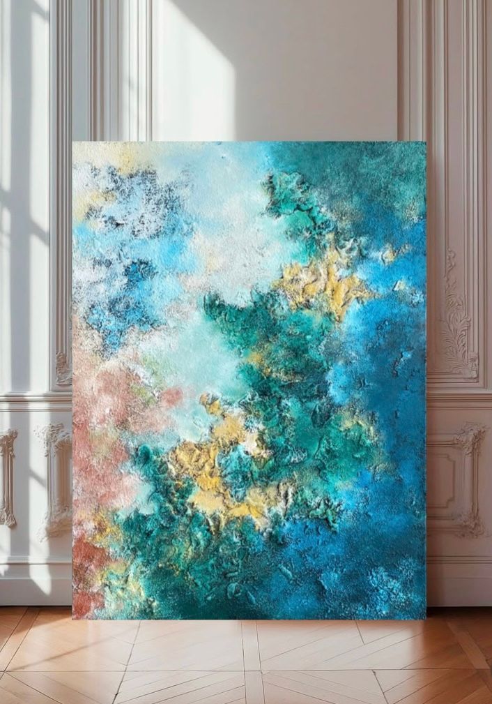 En mi proceso creativo, dejo que la intuición me guíe. Esta conexión me invita a explorar texturas enérgicas y a jugar con contrastes vibrantes en mis paletas. Fusiono una variedad de materias primas naturales, con el objetivo de que cada una de mis obras actúe como un canal que irradie buenas emociones y transmita una felicidad instantánea.